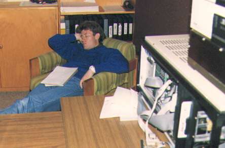 ![]() | Steve Rance, who wrote much of the CMI software, asleep after a long night of assembler programming. |