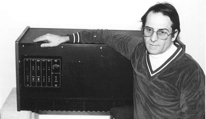 ![]() | Tony Furse with the original Qasar Music Synthesiser. This was a very heavy box full of 74S series logic on 8 inch square wire-wrapped boards, two 6800 micros, 2 8' disk drives, and a 50 amp linear power supply. |